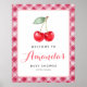 Un alegre cartel de bienvenida con una ducha de temática de cerezo con dos cerezas acuáticas enmarcadas por un borde de gingham rosa. Personaliza con el nombre del invitado y la fecha del evento. Perfecto para saludar a los huéspedes y relacionar el tema de su fiesta de cerezas.