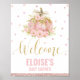 Magnífico cartel de bienvenida de Baby Shower con calabaza floral rosa pequeña / Poster. Con una calabaza rosa adornada con flores rosas bonitos, confiti y detalles de purpurinas dorados. Personalice este encantador poster de bienvenida de calabaza fácil y rápidamente, simplemente presione el botón personalizar it para reorganizar y formatear el estilo y la ubicación del texto. c) El estudio Happy Cat Studio