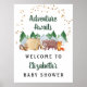 Un poster de señas de bienvenida con una ducha de bebé rústica con un bonito ilustracion de animales de bosque con su tienda acampando en las montañas y el bosque, un overlay de estrellas de oro y "Adventure Awaits" y el nombre de la futura madre en un guión verde oscuro para cazadores.