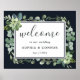 Este cartel de bienvenida boda presenta hojas de color agua suculenta, eucalipto y verde botánico pintadas con un marco rectangular sobre un fondo azul marino de medianoche. También están disponibles los elementos coincidentes.