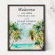 Este elegante y hermoso cartel de bienvenida boda acuático cuenta con una playa, un cielo azul y palmeras. El texto combina guiones manuscritos y sans serif para un estilo elegante y moderno. Es perfecto para una boda de verano o destino tropical.
