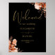 Este elegante cartel de bienvenida de boda floral rústico puede ser personalizado con su información en la tipografía de oro de moda sobre un fondo negro. Diseñado por Thisisnotme©