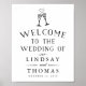 Bienvenido a su boda con nuestro poster de moda, disponible en varios tamaños. El diseño presenta una tipografía negra en blanco fresco con "bienvenida al boda de" y sus nombres y fecha boda debajo, coronada por un par de flamencos de champán ilustrados unidos por un corazón efervescente.