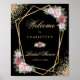 El elegante rótulo de la ducha con flores de color negro y dorado, decorado con un marco geométrico dorado adornado con confeti dorado y flores y vegetación rosa y ruidosa. Elementos coincidentes disponibles. Personalice fácilmente esta plantilla en línea.