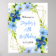Este bonito y elegante cartel de bienvenida presenta una acuarela de flores azul marino y azul marino con follaje. El texto combina el guión manuscrito y las fuentes serif para un aspecto elegante y moderno. Es perfecto para una fiesta de cumpleaños rústica de primavera o verano.
