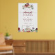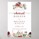 Este rústico cartel de bienvenida para una cena de verano con flores es perfecto para un simple ensayo boda. El diseño se compone de flores de color burdeos, rosa y azul con hojas verdes en un fondo manchado de color marrón.