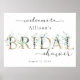 Señal de bienvenida de la ducha de la boda nupcial con letras doradas y hojas de eucalipto de acuarela. Personalizar con su nombre y fecha.