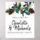 Los arcos de pino y los azulejos están entrelazados y decorados con bayas rojas, pinecones y purpurinas dorados para crear un estribo vacacional que se sitúa en la parte superior del diseño. Los nombres de las parejas de bodas se escriben en negrita. La bienvenida y la fiesta de compromiso se escriben en una fuente serif clásica. Elegante y fácil de editar.