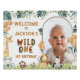 Signo de bienvenida rustico salvaje un Safari primer cumpleaños salvaje mate salvaje un símbolo temático de bienvenida de primer cumpleaños para un niño con varios animales de safari, follaje y globos. Esta invitación salvaje de un cumpleaños también incluye algunas palabras hechas con varias huellas de animales de la jungla y una foto.