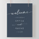 Este boho signo de bienvenida boda azul marino azul marino de moda DIY es perfecto para un boda minimalista. El diseño bohemio moderno azul oscuro, suave y monótono, presenta una caligrafía rústica sencilla con un estilo único y clásico. Personaliza tu cartel de boda de bienvenida imprimible con los nombres de la pareja y la fecha. Elija un poster de signos de bienvenida impreso o una descarga instantánea imprimible que pueda imprimir localmente como un proyecto DIY.