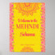 Elegante magenta cereal amarillo brillante Mehndi de bienvenida plantilla de señalización. Vibrantes colores alegres y juguetones para una ocasión especial.