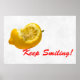 Limón amarillo con un buen bocado sacado de él contra el fondo texturado y un texto rojo ¡Sigue sonriendo! ¡Nunca se rindan y mantengan su mentón en alto! Si la vida te da un limón, ¡haz una limonada con eso!