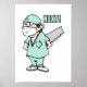 Un dibujo personalizado de un cirujano con una gran mano vio detrás de su espalda gritando "¡PRÓXIMO!"