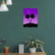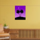 Impresión con una silueta negra de palmeras, sobre un fondo degradado de color púrpura crepúsculo, bajo una delgada luna creciente