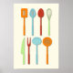 Diseño ilustrativo de las siluetas utensilios de cocina en naranja, rojo, azul claro y verde limón sobre fondo color crema.