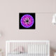 Imagen temática de la ciencia. Una imagen circular con el símbolo del átomo interior. Un fondo rosa contrasta con el símbolo negro. Un borde morado con estrellas blancas rodea el ilustracion. Una imagen genial y divertida para los aficionados a la ciencia y los "geeks".