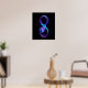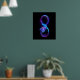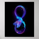Símbolo de infinito violeta y brillante con colibrí azul sobre fondo negro. Neón.