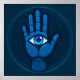 Una representación estilizada de una mano con un ojo en la palma, con una estética azul cósmica. La imagen sugiere misticismo, espiritualidad y protección, evocando temas del Hamsa y el ojo que todo lo ve.