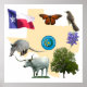 Sobre un fondo blanco, el mapa de Texas está colocado por el Sello Estatal, la Bandera Estatal y los símbolos vegetales y animales oficialmente adoptados del Estado: la flor Bluebonnet, la mariposa monarca, el Mockingbird, el Armadillo, el ganado Longhorn y el árbol Pecan. ¡Es fácil mostrar orgullo por tu Estado!