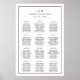 Sencillo poster de la gráfica de asiento boda con un diseño moderno y elegante con su monograma de dos letras, nombres y fecha con la gráfica siguiente, rodeado por un borde delgado. La plantilla consta de tres columnas con doce mesas de ocho personas como ejemplo, pero se puede personalizar para el número de mesas y clientes. Moda y diseño elegante en blanco y negro, ideal para una pareja minimalista.