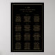 Sencillo poster de la gráfica de asiento boda con un diseño moderno y elegante con su monograma de dos letras, nombres y fecha con la gráfica siguiente, rodeado por un borde delgado. La plantilla consta de tres columnas con doce mesas de ocho personas como ejemplo, pero se puede personalizar para el número de mesas y clientes. Todo el texto está en oro sobre un fondo negro y puede cambiarse a cualquier color que desee haciendo clic en el botón "personalizar". Moda y diseño elegante de una tabla de asientos boda, ideal para una pareja minimalista.