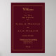 Dark burgundy wine background for simple, yet elegant typography based design. Couple's monogram footer. Goldenrod on medium wine hue. Reverses to solid burgundy color with golden frame and monogram. Welcome foam board sign has varied fonts and single line embellishment under "Welcome". A rich look in color, which works well with Victorian to modern styles.
