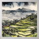 Título: "Tapiz Esmeralda: Sinfonía de Paddy de Bali" Esta obra maestra de acuarela te transporta a los pintorescos arrozales de Bali, donde el ritmo de la naturaleza y el cultivo humano se mezclan en perfecta armonía. La hábil mano del artista capta la lujuria de los campos, donde la vegetación vibrante se extiende hasta el horizonte bajo un cielo sin límites. Cada terraza de arroz está pintada con precisión, con una atención destacada a los detalles, creando un fascinante tapiz de formas y tonos entrelazados. El medio acuarela da un caudal orgánico a la composición, reflejando el paisaje ondulante y la suave pendiente de las plantas de arroz en la brisa.