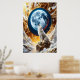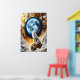 Un majestuoso lobo blanco aullaba a la luna, bañado en una luz dorada, contra un telón de fondo de nubes agitadas y cuerpos celestes. El lobo se alza sobre un brote rocoso, con su silueta enmarcada por la luna creciente.