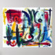 Los verticales negros se intersectan con las otras formas de color para crear movimiento como una página de la música de hojas en acción. Se presenta en acrílico.