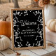 Bienvenido a los huéspedes con un estilo espeluznante con este poster de señas de bienvenida con temática de Halloween, que presenta un guión en negrita y blanco de "Bienvenida" con el nombre de la futura madre y la fecha de ducha que se muestra a continuación. Rodeado de esqueletos bailarines juguetones sobre un fondo negro, este diseño marca la pauta para una celebración festiva de inspiración gótica o de Halloween. Disponible como poster impreso, descarga digital, o ambos, es perfecto para mostrarse a la entrada de su lugar de celebración y parejas sin problemas con la decoración de la ducha de bebé con temática de esqueleto para crear una primera impresión memorable.