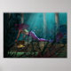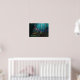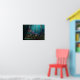 Poster de colores vivos y brillantes, con una fantástica escena submarina: una sirena de cola morada y un cofre de tesoros dorados brillantes.