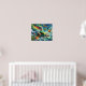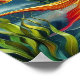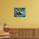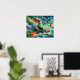 el aceite abstracto pintado con una imagen de una aleta de sirena en la parte superior roja y verde sobre una roca con el océano y otros cinco peces tópicos coloridos y ballenas y focas alrededor de ella con un cielo azul. Este diseño presenta brillantes colores de alumbrado dorado y una potente pose.