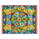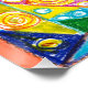 Los patrones geométricos vibrantes llenan la imagen, con círculos, triángulos y remolinos en un calidoscopio de colores que incluyen azul, verde, amarillo y rojo. El diseño intrincado crea una sensación de simetría y equilibrio.