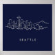 Este diseño presenta un bosquejo dibujado a mano del perfil de Seattle sobre un fondo azul oscuro.