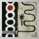 Una pintura abstracta con una línea curva a la derecha, como un curso de slalom, luego un asterisco unido a él, y a la izquierda, una cadena blanca con acento rojo y pequeñas rayas negras y blancas en la parte inferior.