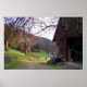 A rustic wooden barn stands beside a dirt path that leads to a grassy field, surrounded by leafless trees. Sunlight gently illuminates the landscape, casting shadows and highlighting the tranquil rural setting. Photo taken in Germany not to far from Bad Berneck