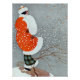 Art Deco vintage illustration of a woman wearing a red fur lined winter coat and hat, standing in the blowing snow with a cluster of snow buntings flying in front of her. Magazine cover illustration by Will Hammell (1914).