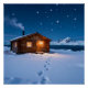 Snowy Log cabin poster. This poster features a wintery seen with a log cabin with it's lights on, it is night time and snow is falling, a trail of footprints can be seen leading towards the cabin. Beautiful snow scene poster.