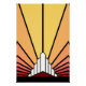 Un clásico estilo Art Déco patrón sol en colores del amanecer. Un patrón icónico del sol saliendo por detrás de un estilizado edificio de estilo Art Déco. Un diseño sencillo pero elegante, fiel a la época.