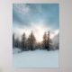 Paisaje cubierto de nieve y abetos árboles con un hermoso cielo y sol brillando a través de las nubes.