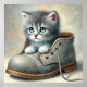 Esta obra de arte representa una conmovedora escena de un gatito gris esponjoso enclavado en un zapato de cuero desgastado. Los grandes ojos azules del gatito parecen tener un toque de curiosidad y tal vez un toque de soledad. El contraste entre el gatito minúsculo y el zapato grande crea un sentimiento de asombro y añade encanto a la imagen.