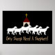 Una fila de ovejas marchan obedientemente en una línea con una iglesia en el fondo y las palabras "Sólo las ovejas necesitan un pastor". Una buena manera para que los librepensadores demuestren que no son simples ovejas marchando ciegamente hacia el dogma de otra persona.