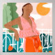 Una mujer se reclina, tomando la cálida luz del sol, rodeada de exuberante vegetación y flores florecientes. Los pasteles suaves y los naranjas audaces crean una atmósfera de verano relajada y soñadora. La escena captura un momento tranquilo de calor silencioso y belleza sin esfuerzo.