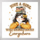 Encantador ilustracion con una chica apoyándose en un montón de libros y una pila de libros en su cabeza. El colorido texto dice: "Sólo un chica que trae libros por todas partes". Este diseño está disponible en una amplia variedad de productos.