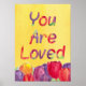 Un poster de aliento colorido con "Eres querido" y una hilera de flores de tulipán en brillantes tonos de naranja rojo, púrpura y amarillo sobre un fondo de color amarillo de agua.