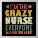 Retro vintage divertido diseño de citas de enfermeras I'm The Crazy Nurse Todos le advirtieron, para enfermeras y amantes de la enfermería, mujeres y hombres. Equipo sarcástico perfecto para estudiante de enfermería, enfermera registrada, asistente de enfermería certificada, enfermeras veteranas, enfermera práctica licenciada, enfermeras de la UCI, enfermeras de urgencias o trabajadores de la salud. Funny ropa sarcástica para enfermeras y amantes de la enfermería, idea de regalo impresionante para mamá, papá, hermana, hermano, hija, esposa, tía, abuela... Ideal para estar en el hospital, clínica, sala de emergencias, escuela de enfermería o en cualquier institución médica.