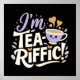 El diseño incluye la frase puntiaguda "¡Soy el TEE-Riffic!" La palabra "TEA" es una jugada en la palabra "fantástico". El texto es una mezcla de tipos de letra, con "I'm" en un guión púrpura purpurinoso y "TEA" y "¡Riffic!" en un tipo de letra audaz y estilizada con una sombra dorada. En el texto se esconde una taza de té al estilo personalizado con cara feliz, con vapor surgiendo de ella en forma de corazones dorados. El conjunto está decorado con pequeñas hojas, flores y estrellas, lo que añade un encanto excepcional. El fondo negro hace que los colores cálidos y el brillo destaquen. Este sería un diseño perfecto para una taza, una camiseta o un poster.