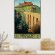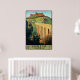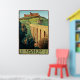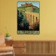 Este poster de viajes vintage es de un castillo en una colina que anuncia Spoleto, Italia. Los naranjas y los verdes