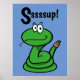 Serpiente de cascabel de dibujos animados verde divertida. Tiene grandes ojos ovalados con cejas levantadas. Una sonrisa descarada con la lengua fuera. Su largo cuerpo enroscado tiene un cascabel en la punta de la cola. Sobre la serpiente en letras negras hay un juego con la palabra Sup! que se lee Sssssup!