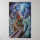 Oil painting depicting a stained glass cabin in the snowy mountains
